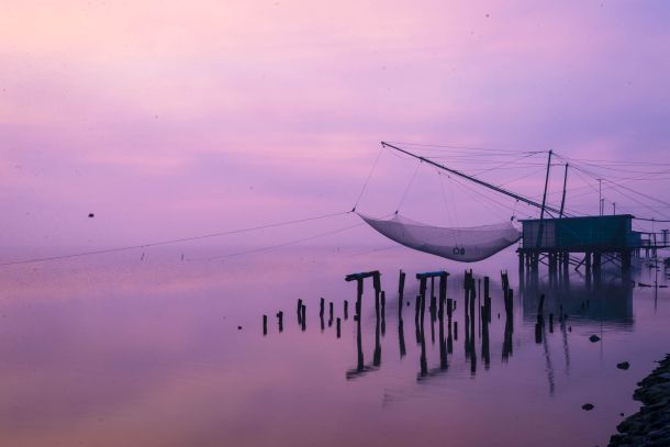 La foce del Po : Dove il fiume si divide in rami sottili prima di entrare in mare. Dall'alto o da una barca, le geometrie create dai canneti e dai banchi di sabbia sembrano quadri astratti.